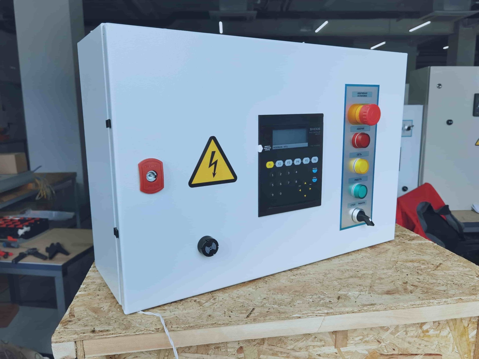 Система автоматики работает на контроллере Segnetics SMH4. Контроллер принимает сигналы с датчиков и выдает управляющие сигналы, соответствующие режиму и алгоритмам работы, на исполнительные устройства и реле для управления технологическим оборудованием. Шкаф имеет степень защиты IP54.