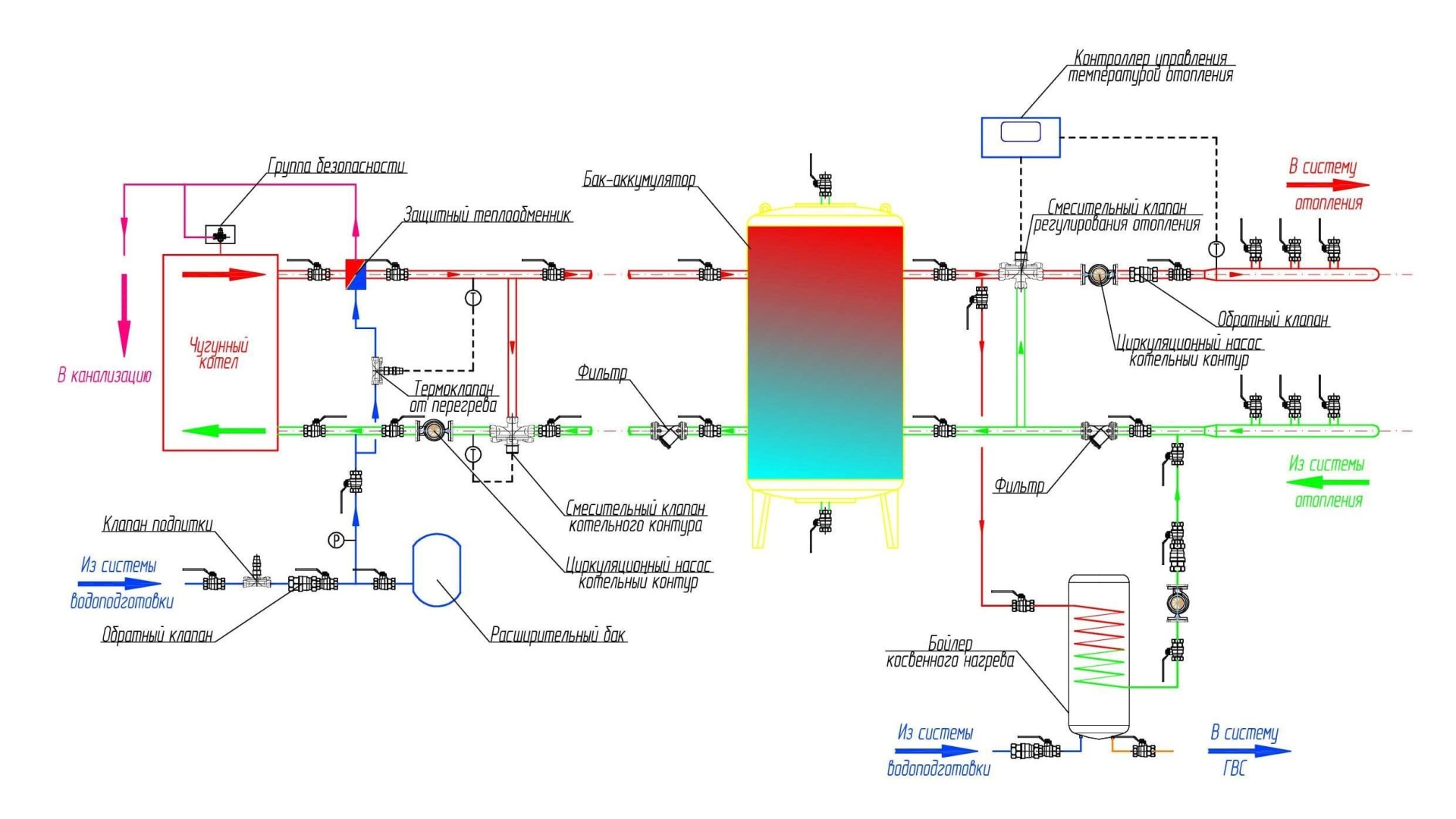 Ниже представлена схема подключения твердотопливного чугунного котла с баком-аккумулятором - буферной емкостью.